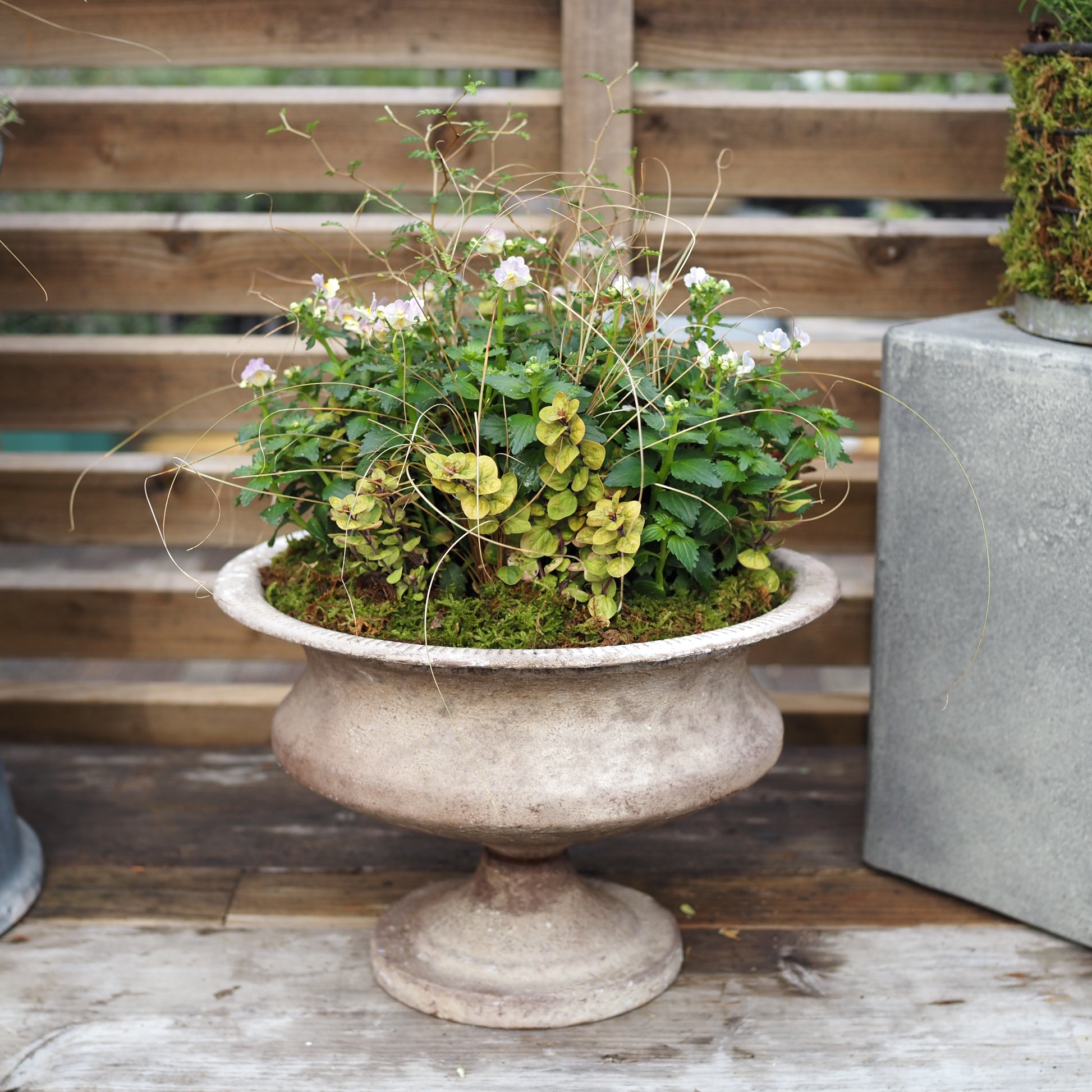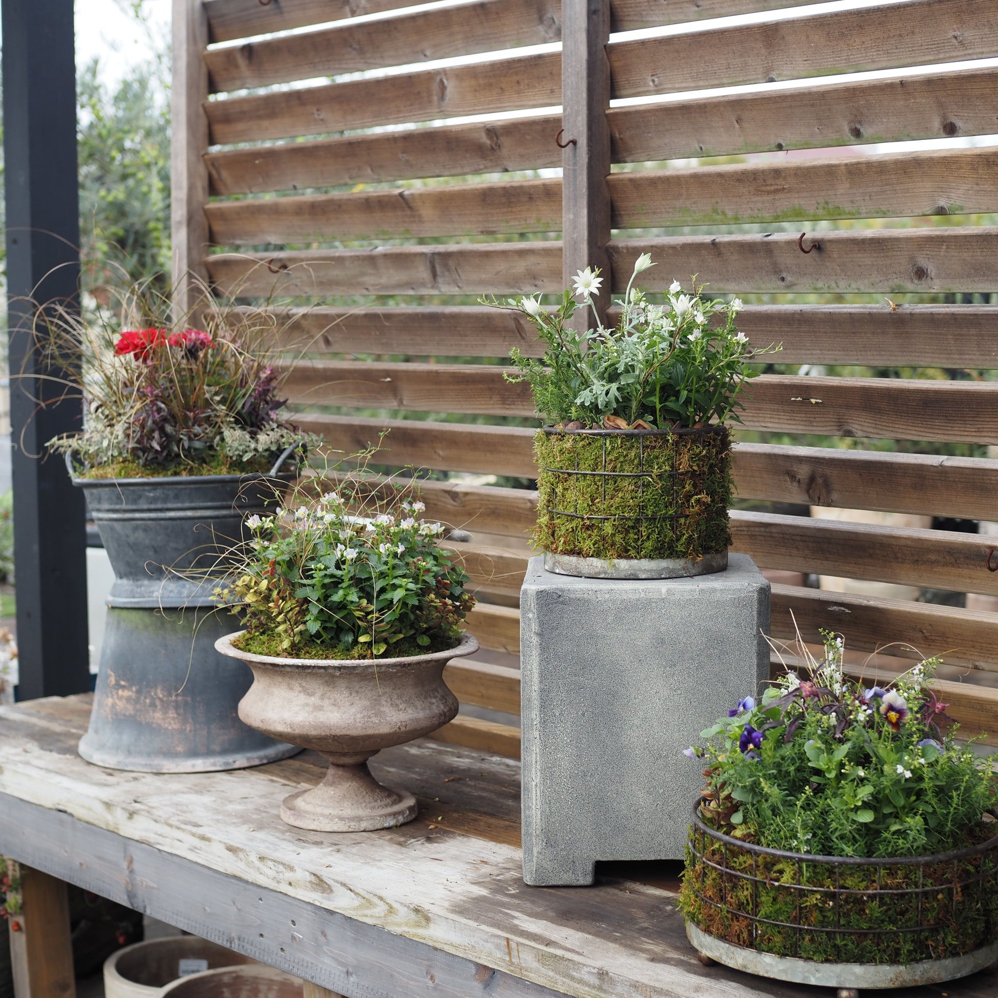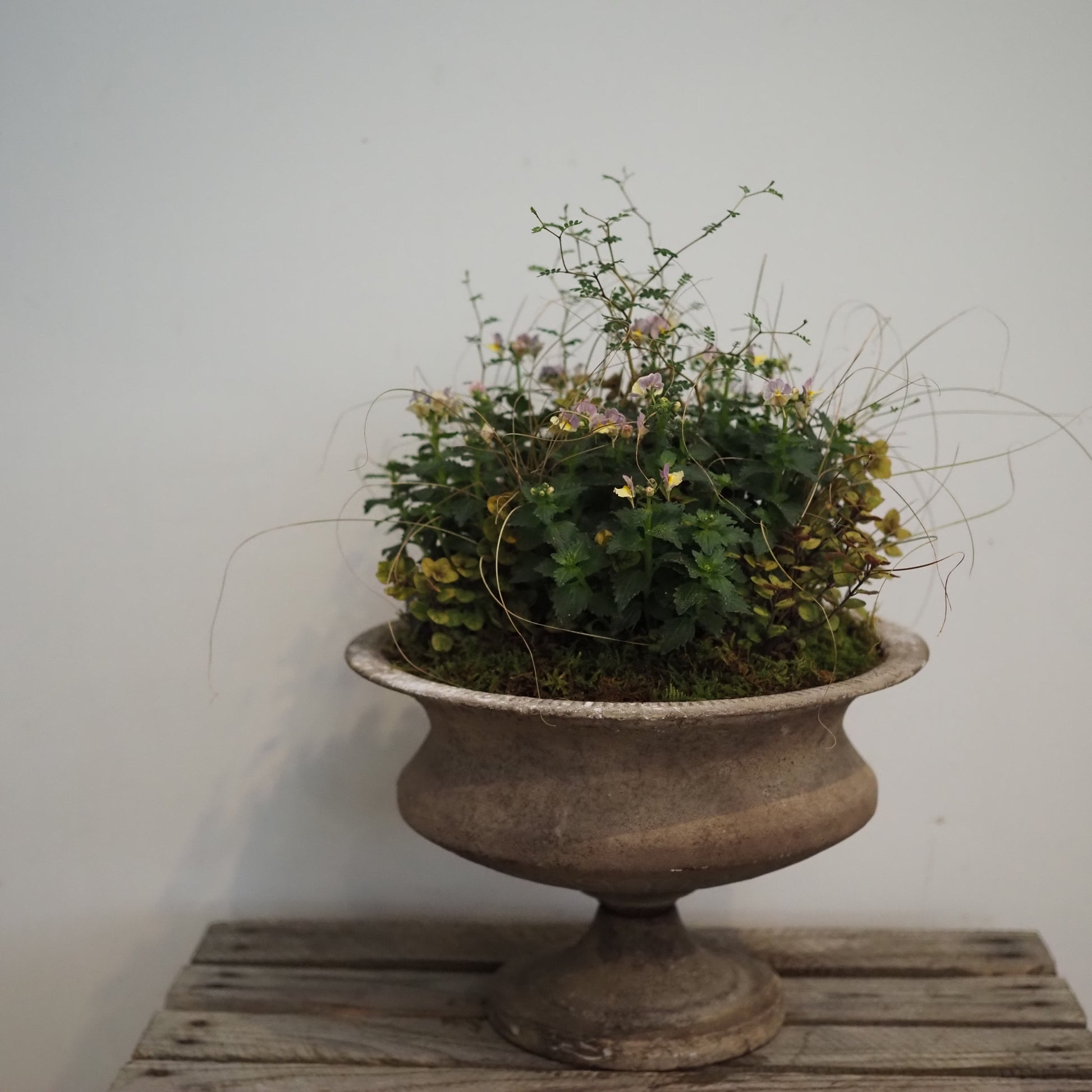 やさしい色合いのネメシアを主役にブリキ鉢がナチュラルな雰囲気を引き立て玄関先、テーブルにぴったり!!