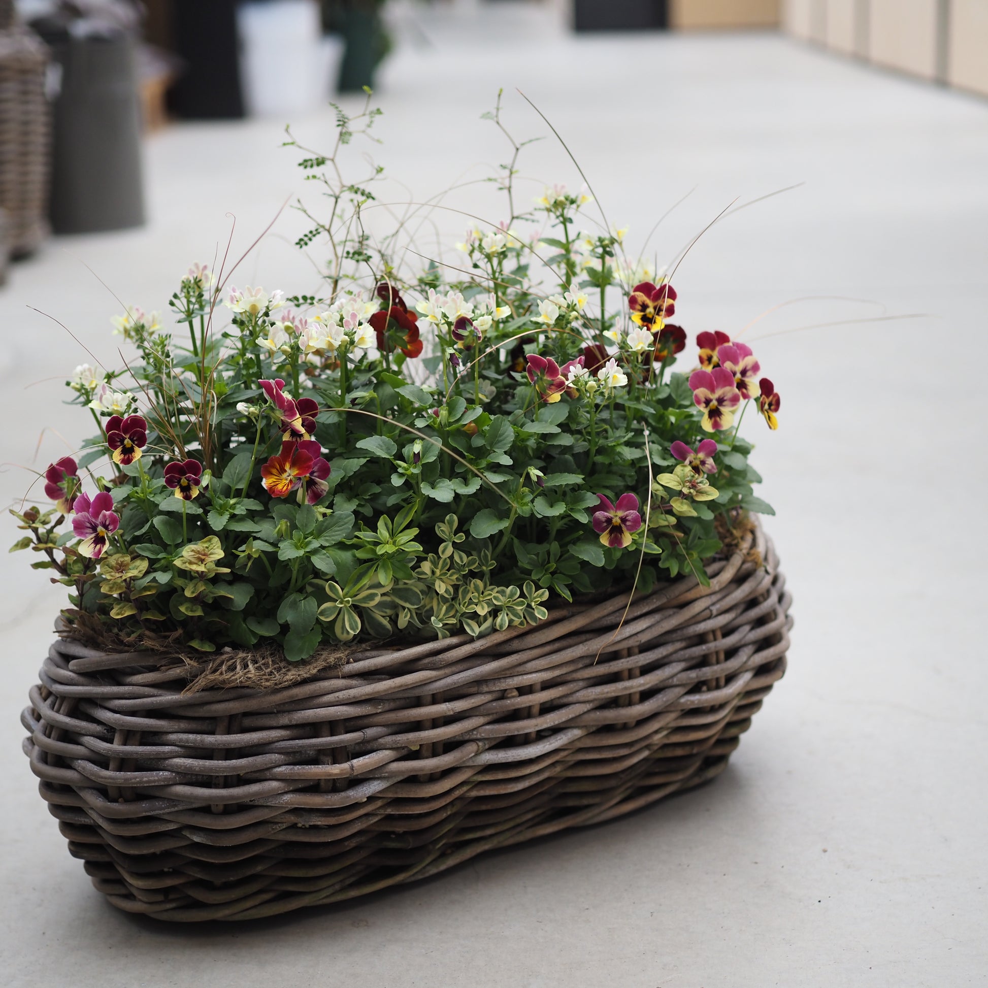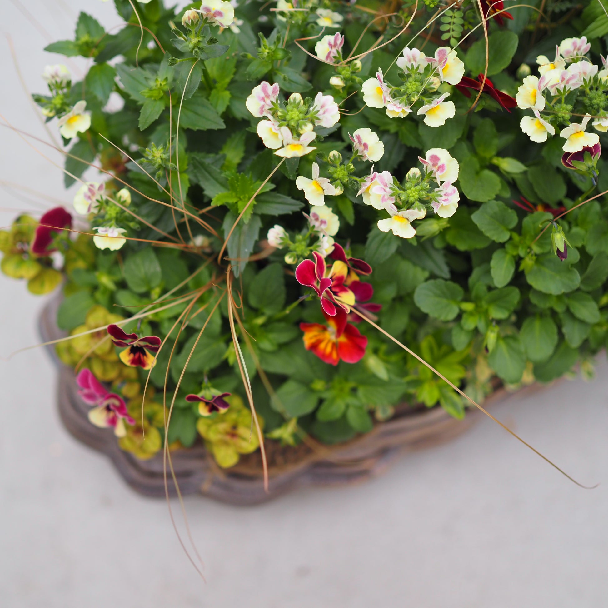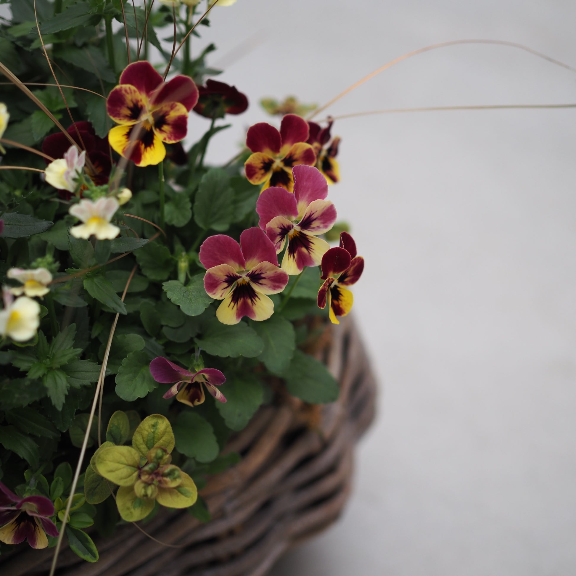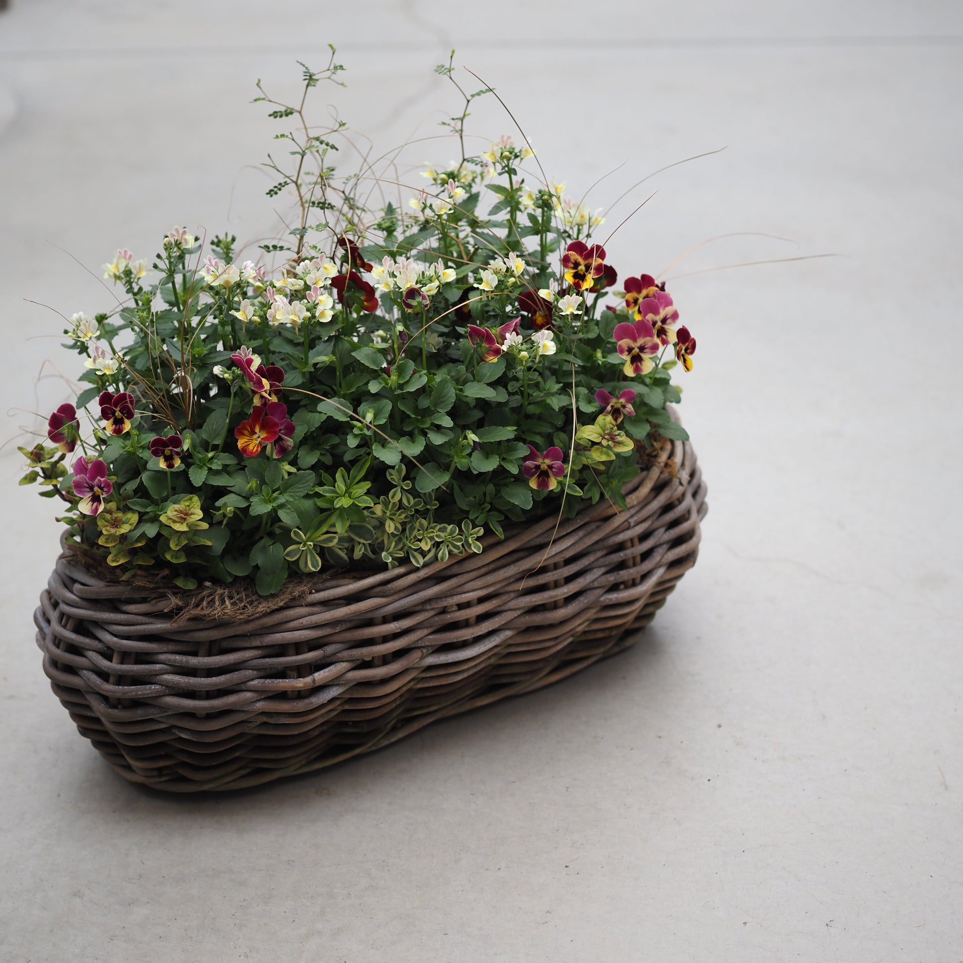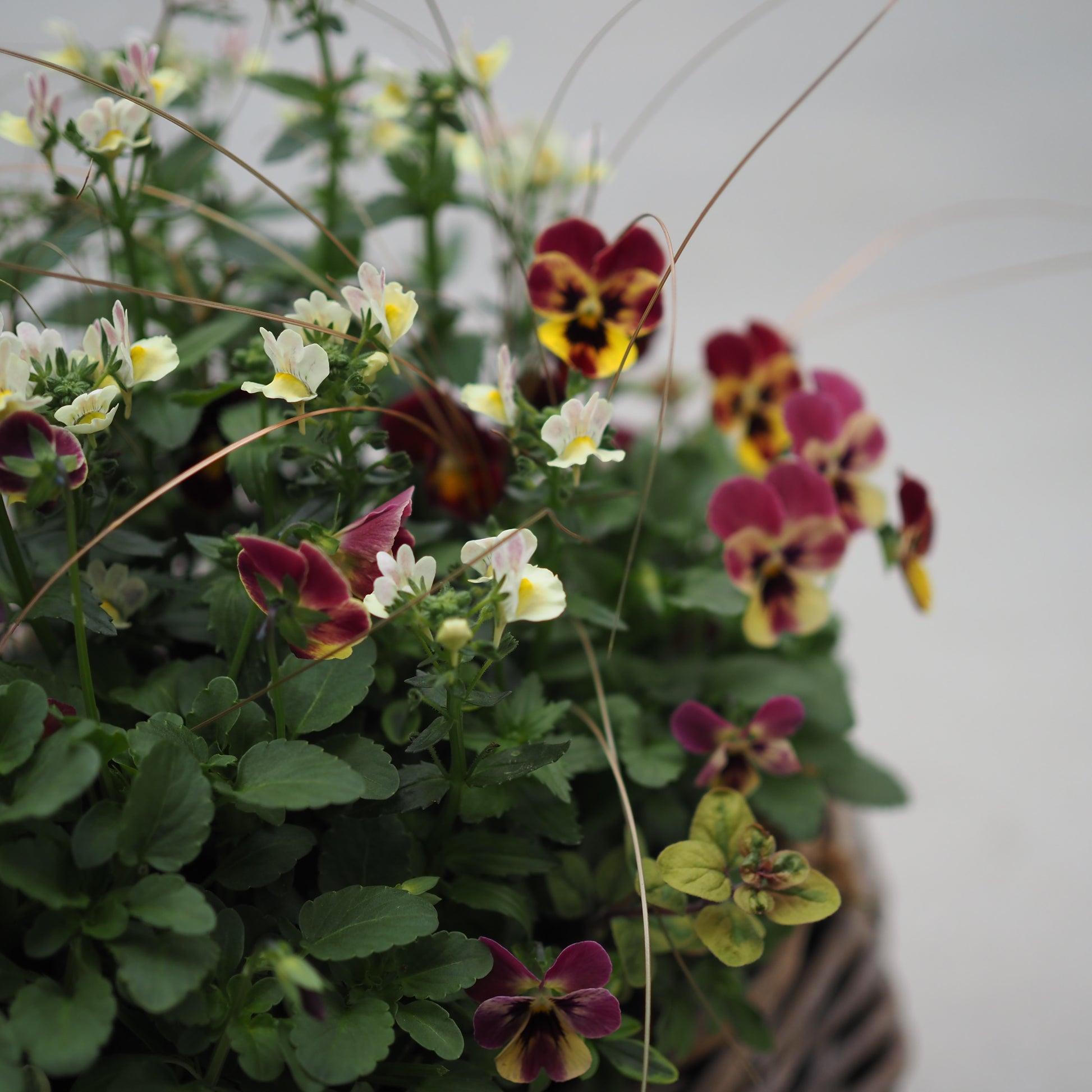 秋を彩るビオラとネメシアをナチュラルテイストのかごに寄せ植えました。