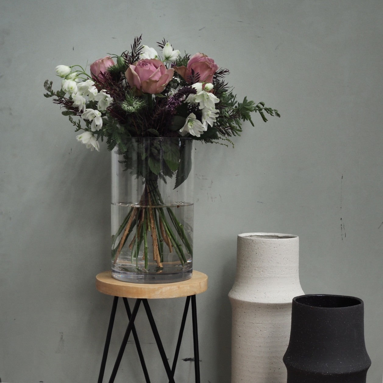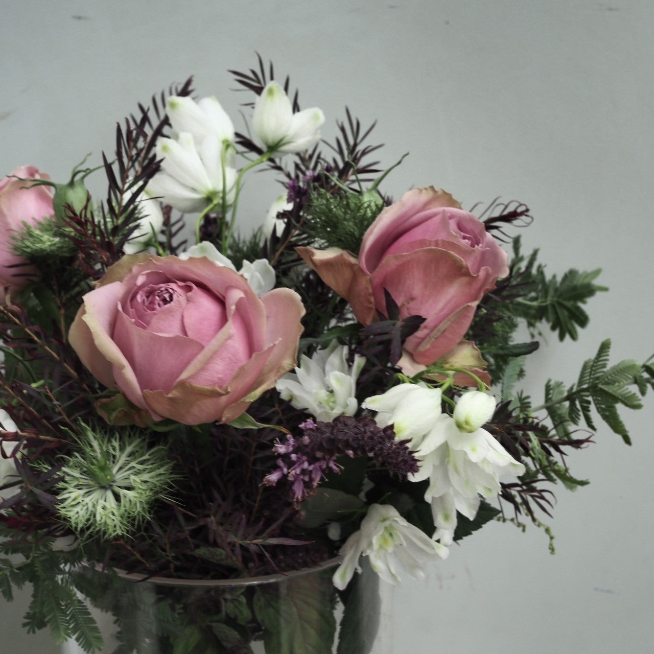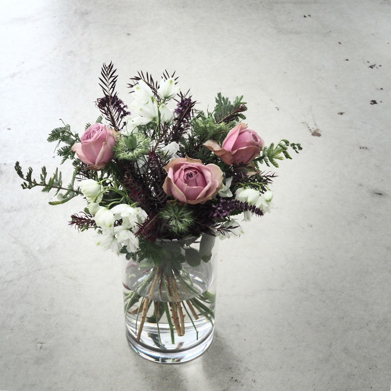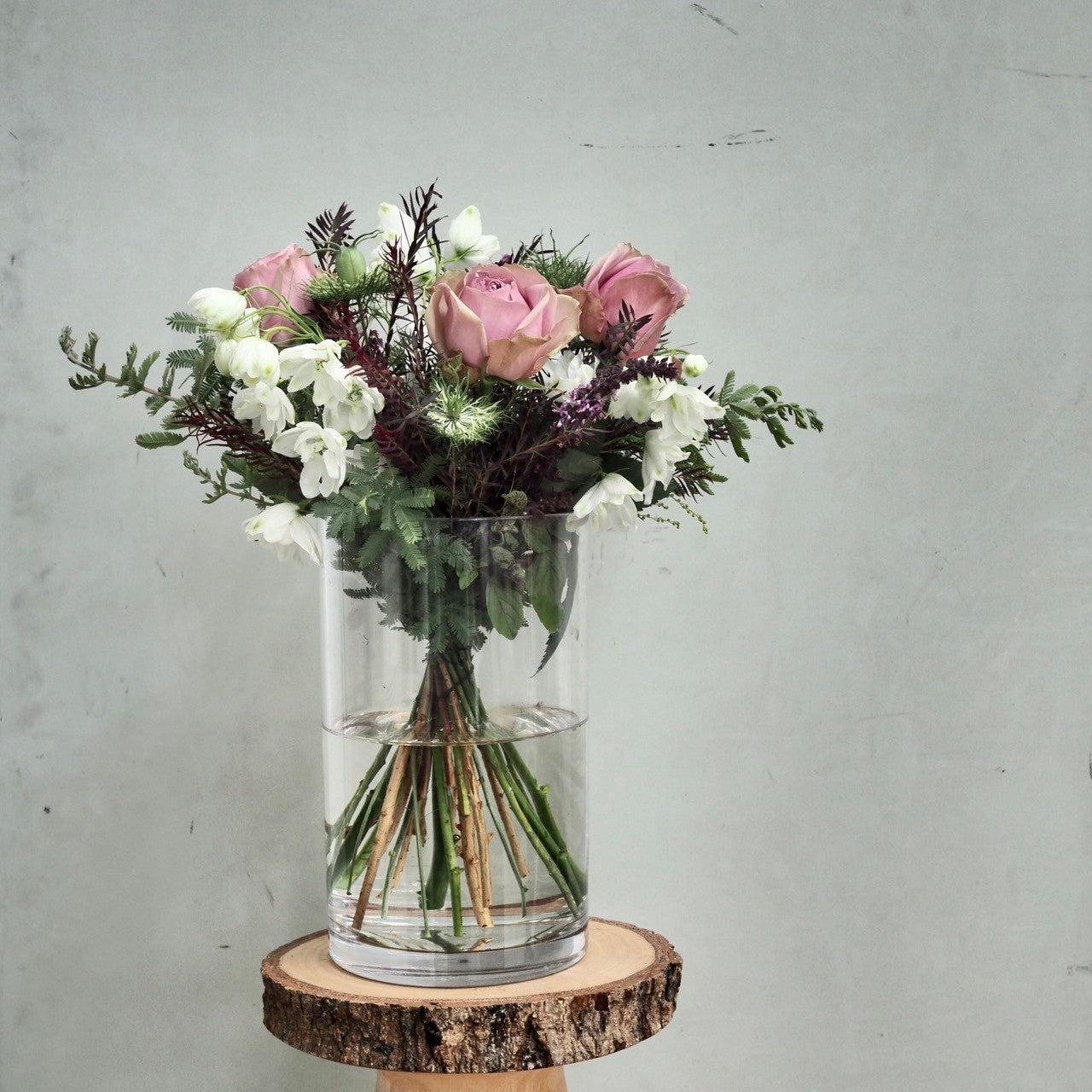色目にあわせてスタッフがお花と葉物を合わせたナチュラルな雰囲気で仕上げます。 届いてすぐに飾って楽しんでいただけるよう、花瓶とセットで購入もできます。