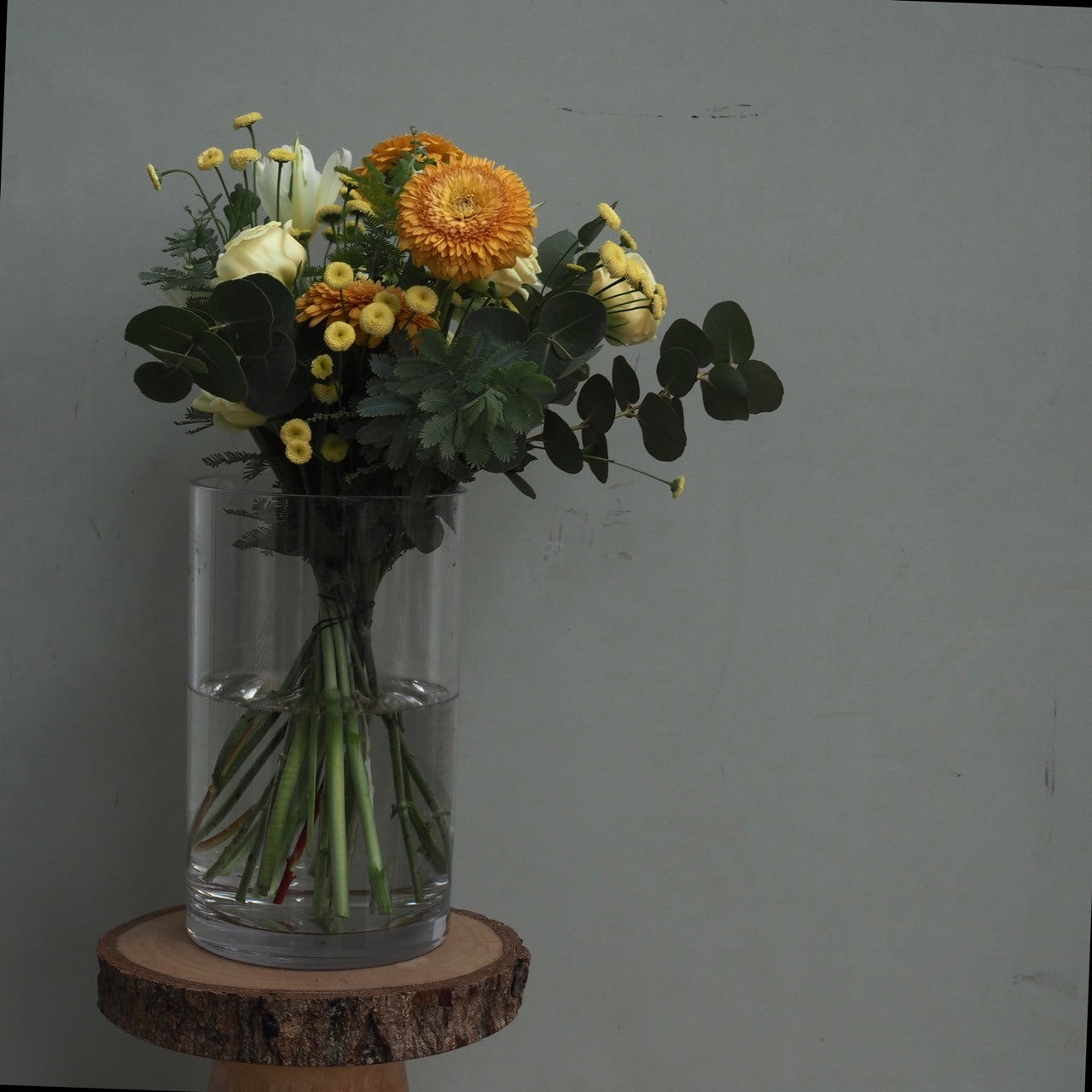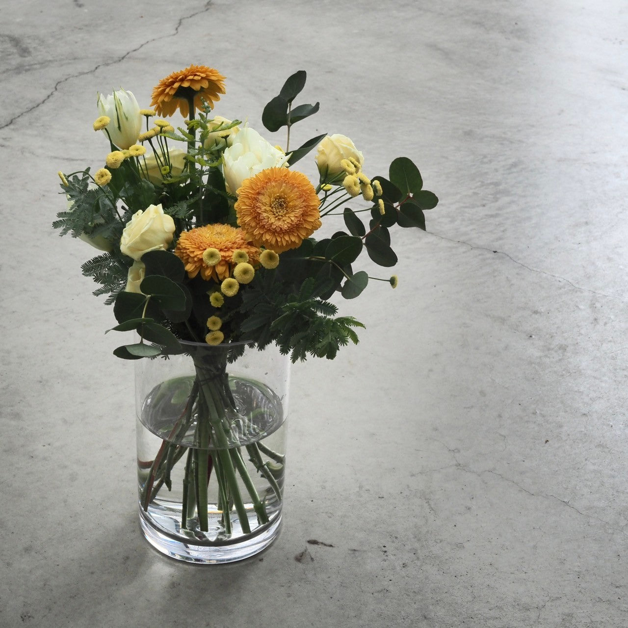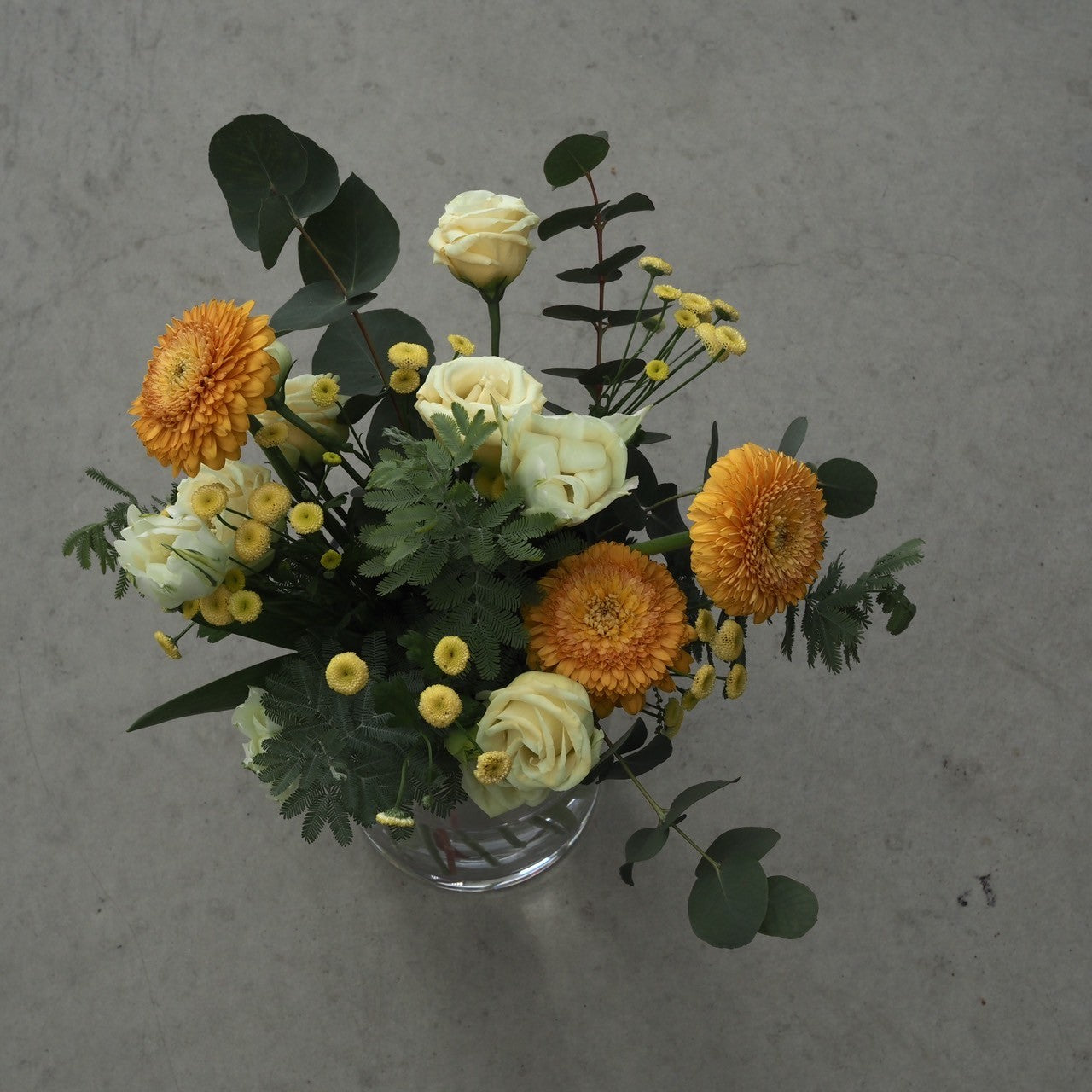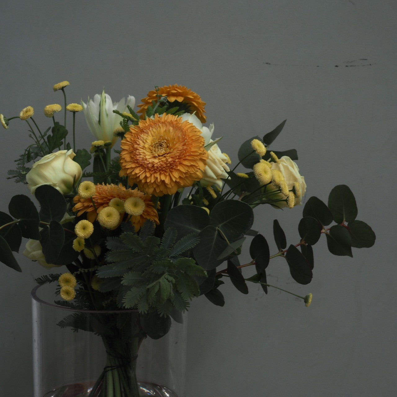 色目にあわせてスタッフがお花と葉物を合わせたナチュラルな雰囲気で仕上げます。 届いてすぐに飾って楽しんでいただけるよう、花瓶とセットで購入もできます。
