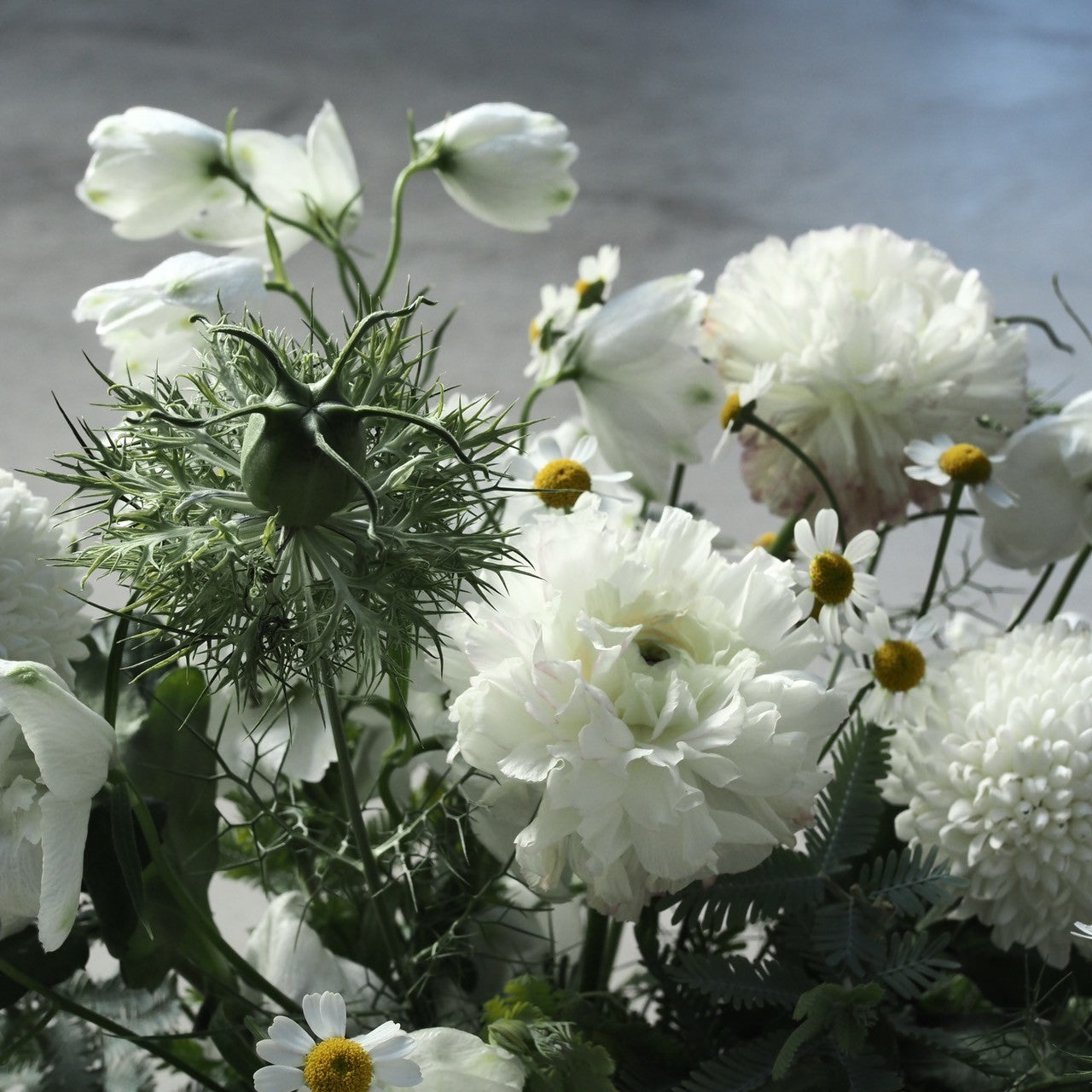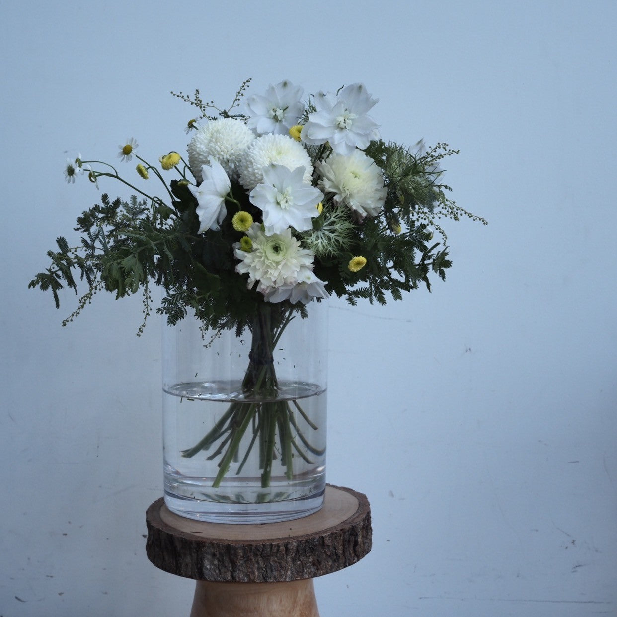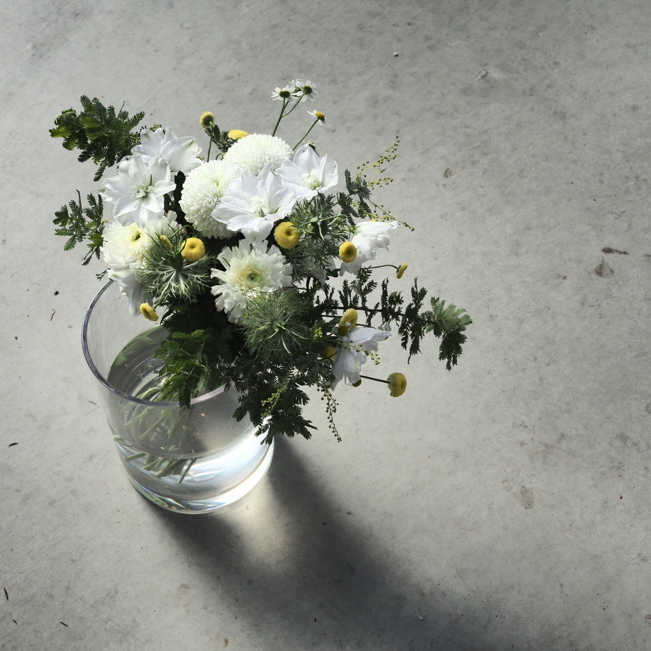 故人を偲び哀悼の意を伝えるお供え・お悔やみのお花です。優しげな白色のお花を基調とした上品な花束です。法要、命日や日々のお供えに。※スタッフがおまかせで制作するため時期によって花材が変化します。お写真とは仕上がりが異なることがございますので、ご理解ご了承下さい